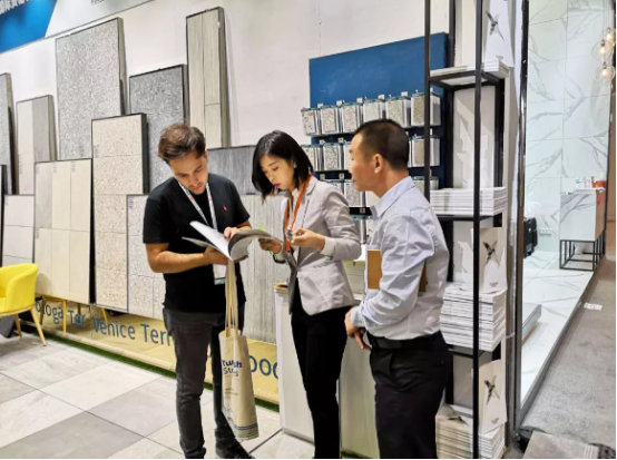 來(lái)自全球各地的客商,紛紛來(lái)到天欣科技×佛諾倫莎的展館參觀與洽談貿(mào)易合作,對(duì)于天欣科技在仿古磚的質(zhì)感和花色上,以及對(duì)于代表目前國(guó)內(nèi)高水平的2cm厚磚,客戶給予了充分的肯定,我們也再一次向世界展現(xiàn)了“CHINA”的力量。
